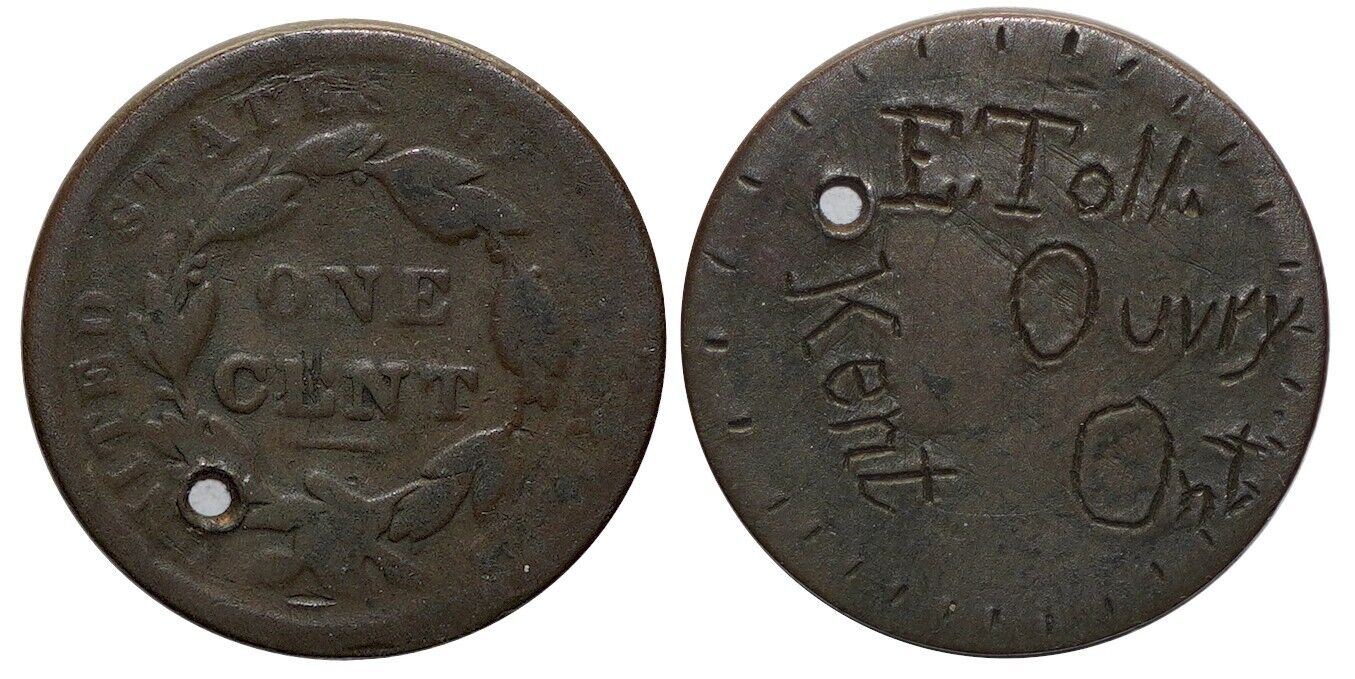 American large cent engraved with “E. Toll Ouvry, Kent, Ont“