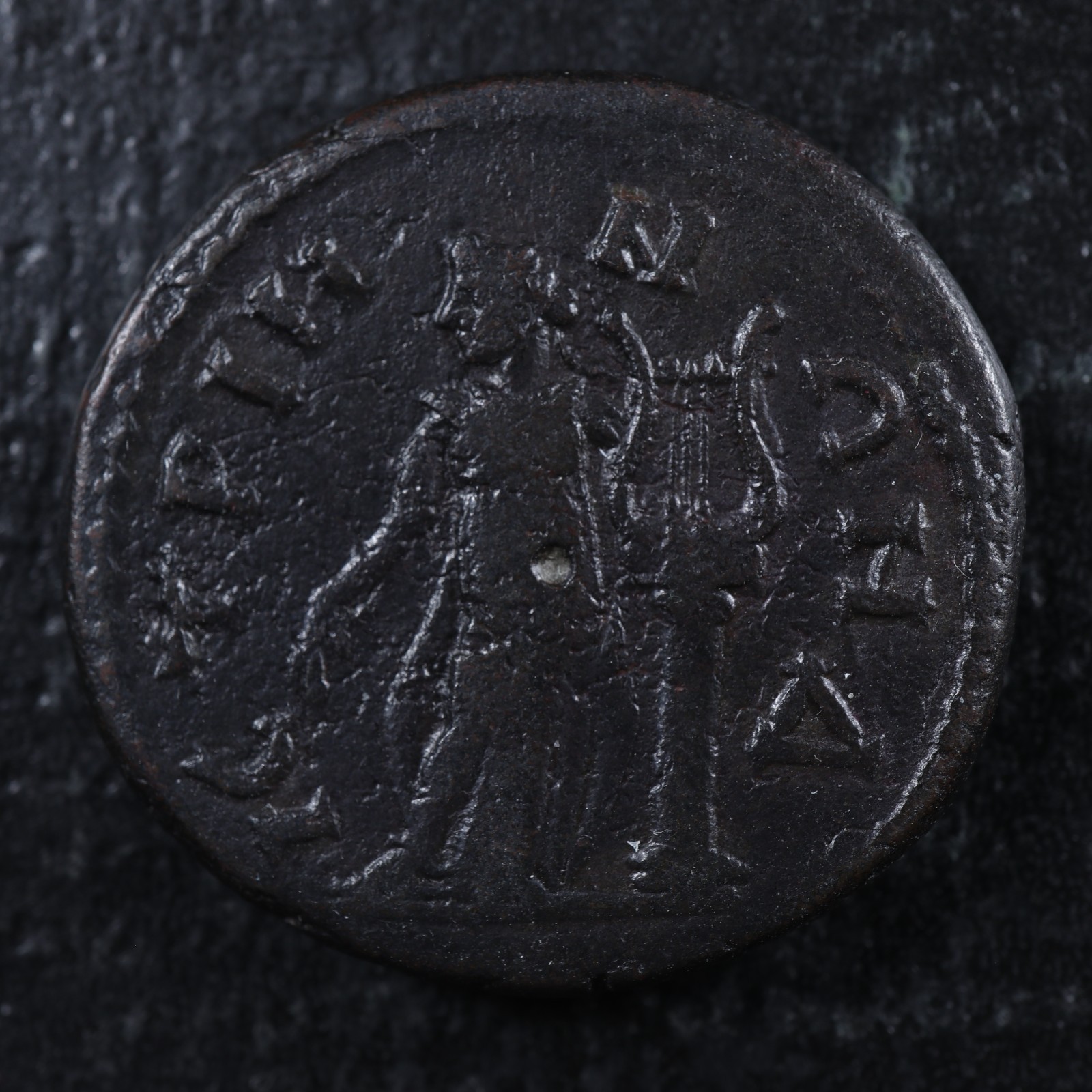 Rev.: ΙCTPIHNΩN, Apollo standing facing, head left, holding plectrum and resting on lyre set on column to right; in right field, Δ (mark of value).