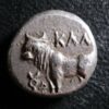 Obv.: Bull standing left on ear of corn, caduceus(or grain ear) and YT-monogram in front, above KAΛ.