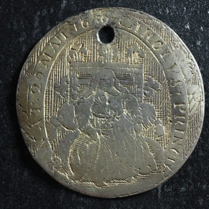 Silver gaming jeton (token or also silver counter), from the Sovereigns of England Series. Struck circa 1635-1637. Because of the legend I am tempted to say the obverse is Charles II as Prince of Wales but it looks like a woman seating. I wasn't able to find the obverse (I don't own the book from Mitchiner).