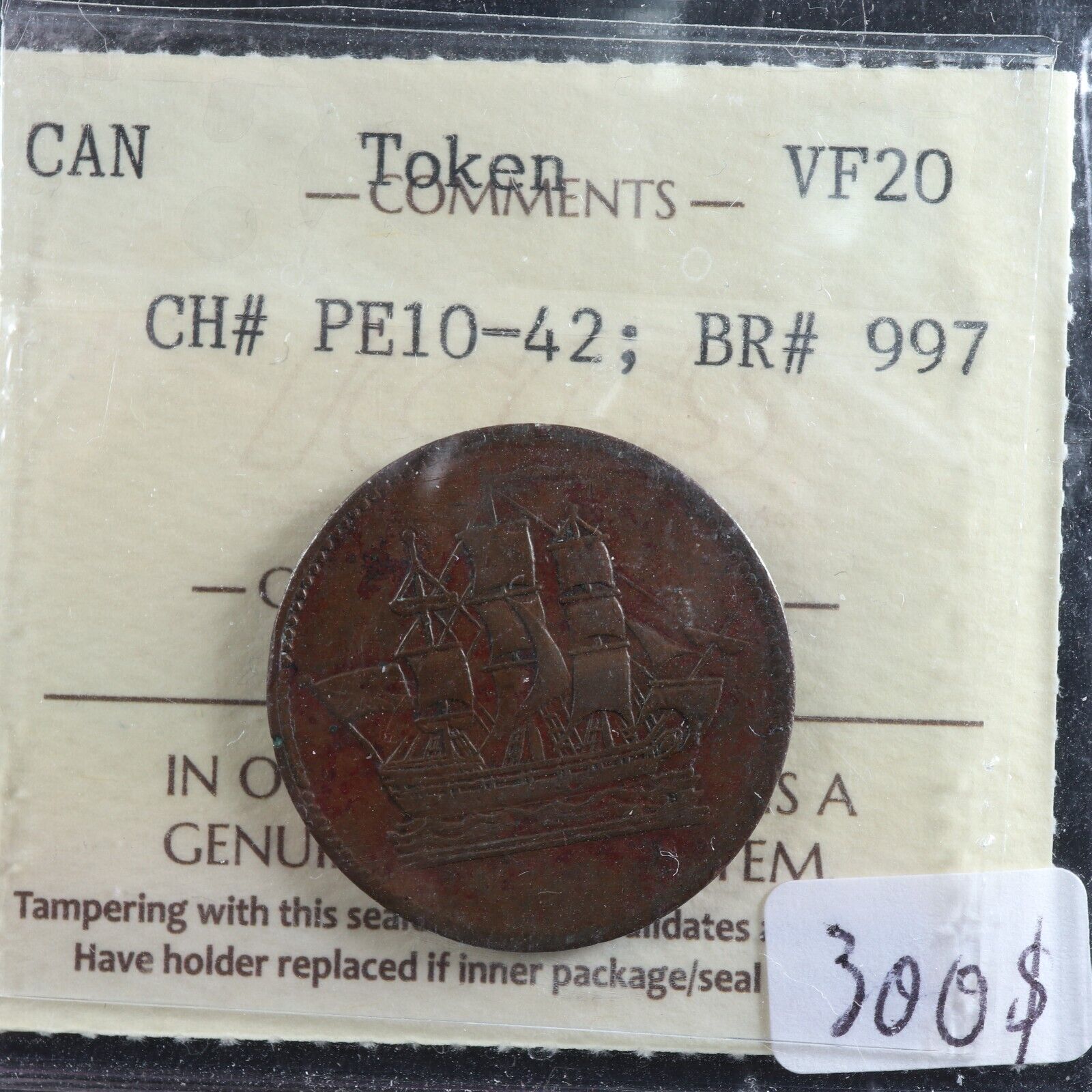 PE-10-42 ICCS VF-20 Ships Colonies & Commerce token PEI Canada Breton 997