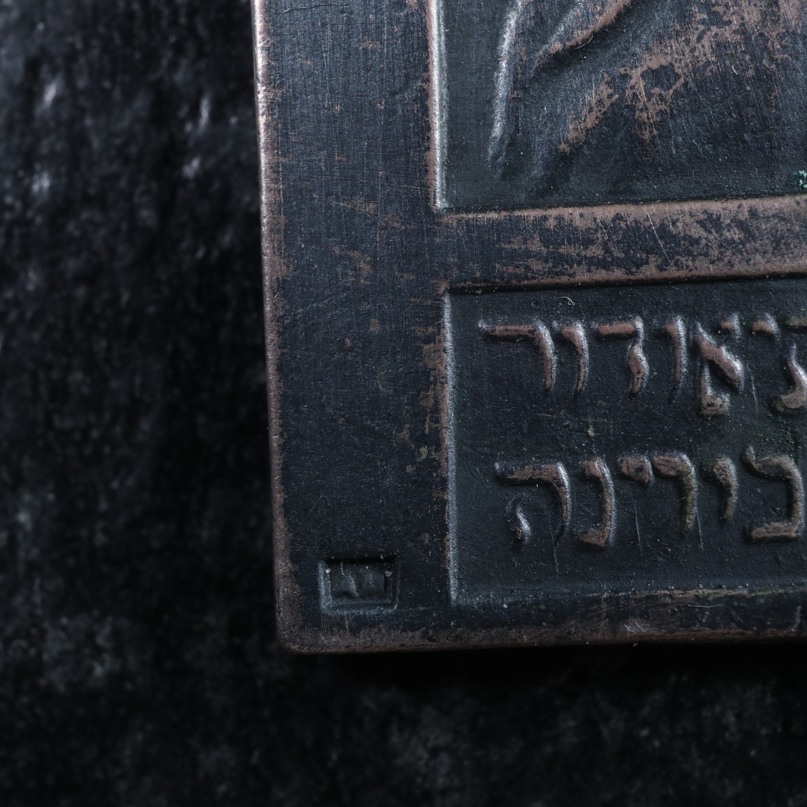 Those are very likely the initials of the graphic artist Herman Struck (1876-1944) who was widely known for his etchings. On his way back from Palestine in 1903 he met Herzl in Vienna and this meeting resulted in the now famous etched portrait of a prematurely old Herzl at 43. Struck was only one of four artists who knew Herzl and created images of him during his lifetime. Struck was also known to have etched those initials and a star on many of his etchings and most likely he produced the design for this medal, because he was not a sculptor or medalist.