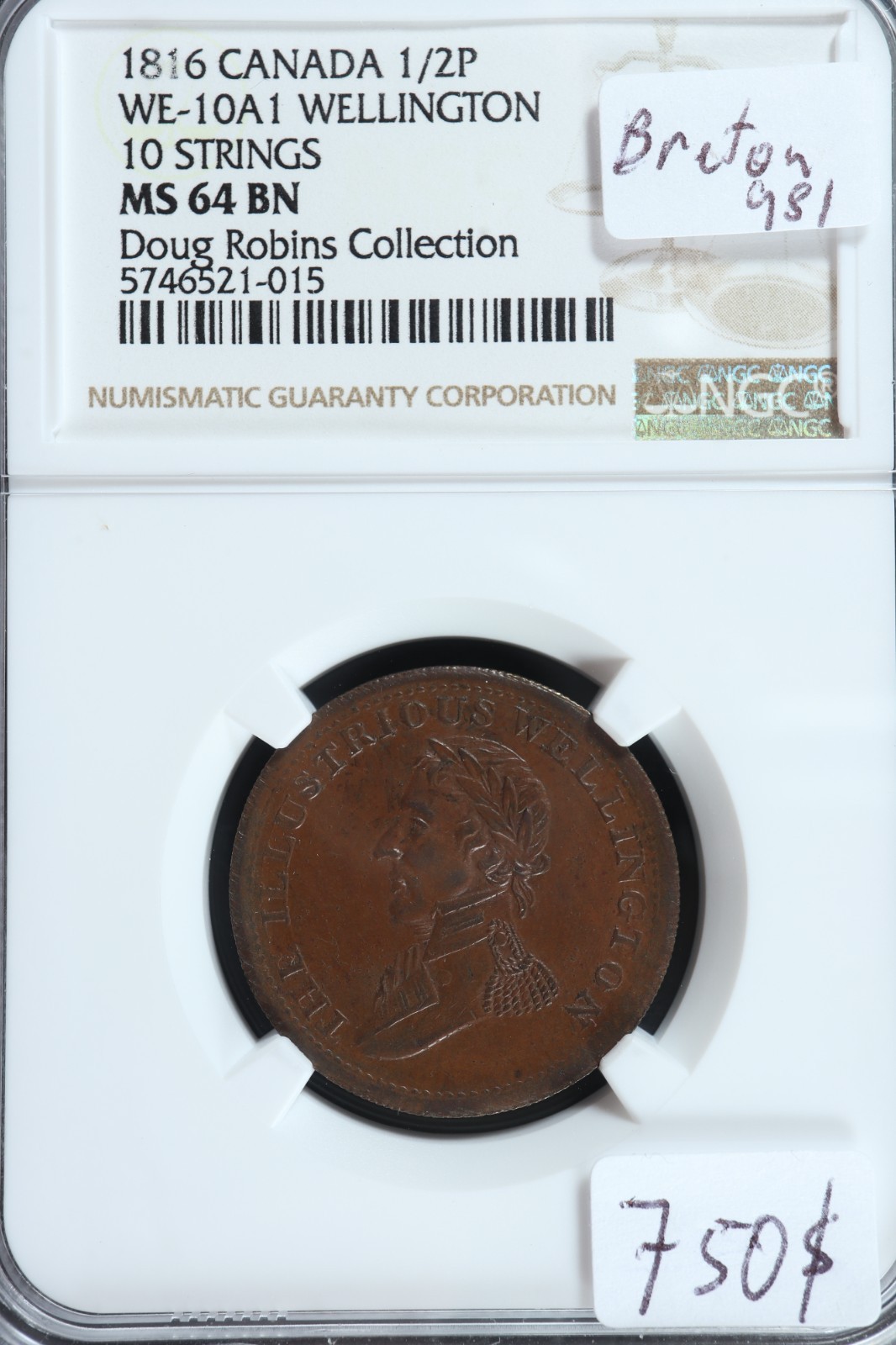 WE-10A1 NGC MS-64 Halfpenny 1816 token Wellington Waterloo Canada Breton 981 quantity